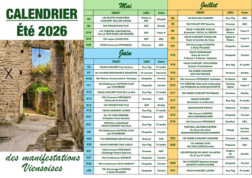 Nous vous invitons à noter dès à présent les dates qui vous intéressent. Ensemble faisons de cet été 2026,une saison mémorable placée sous le signe du partage et de la fête.