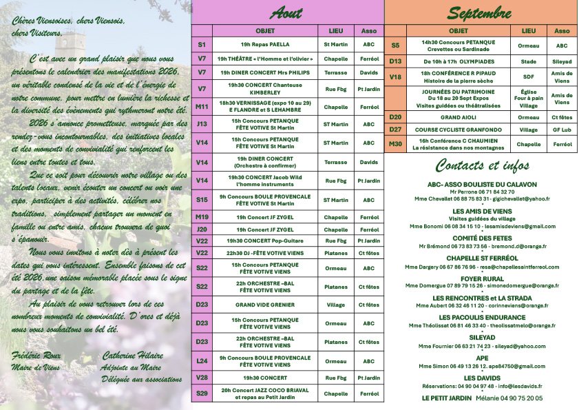 C’est avec un grand plaisir que nous vous présentons le calendrier des manifestations 2026, un véritable condensé de la vie et de l’énergie de notre commune, pour mettre en lumière la richesse et la diversité des évènements qui rythmeront notre été.