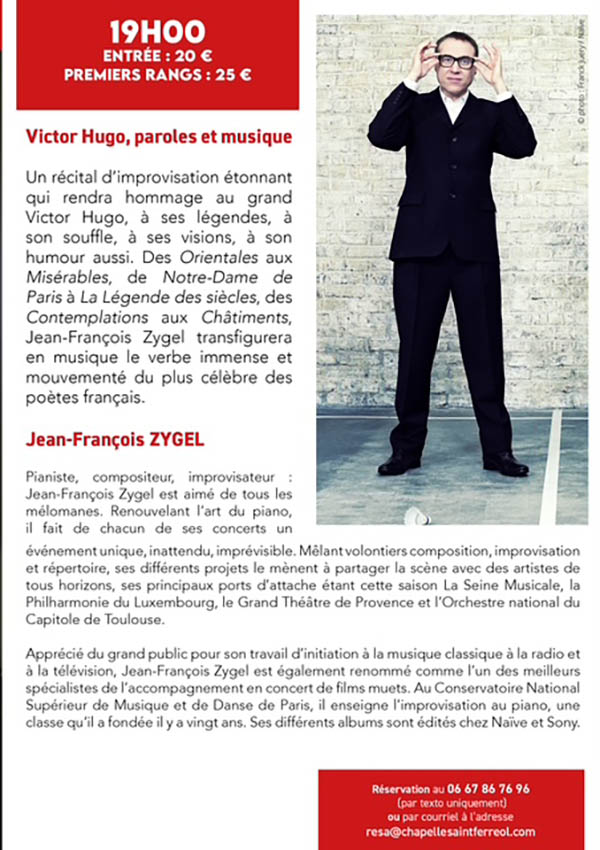 Entre les deux concerts qu’il donne traditionnellement chaque été à La Chapelle Saint-Ferréol, Jean-François Zygel animera cette année en public un atelier d’improvisation convivial et chaleureux.