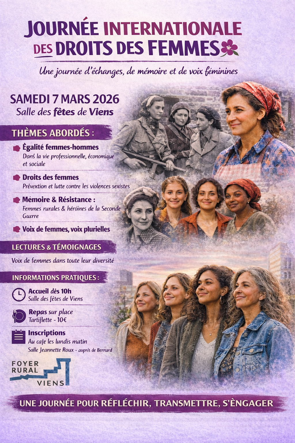 Accueil > Actualités > Journée internationale des droits des femmes Journée internationale des droits des femmes Publié le jeudi 5 mars 2026 Le samedi 7 mars salle des fêtes échanger, transmettre, partager... N’oubliez pas de réserver pour la tartiflette ! Agenda 1 Événement Samedi 7 mars À 10 h Voir aussi Délibérations du conseil municipal du 3 mars Publié le jeudi 5 mars 2026 Délibérations du conseil municipal du 3 mars Offre découverte au sanglier paresseux Publié le lundi 2 mars 2026 Offre découverte au sanglier paresseux Carnaval des écoles du RPI Publié le lundi 2 mars 2026 Carnaval des écoles du RPI Construction de murs en pierre sèche Publié le lundi 2 mars 2026 Construction de murs en pierre sèche