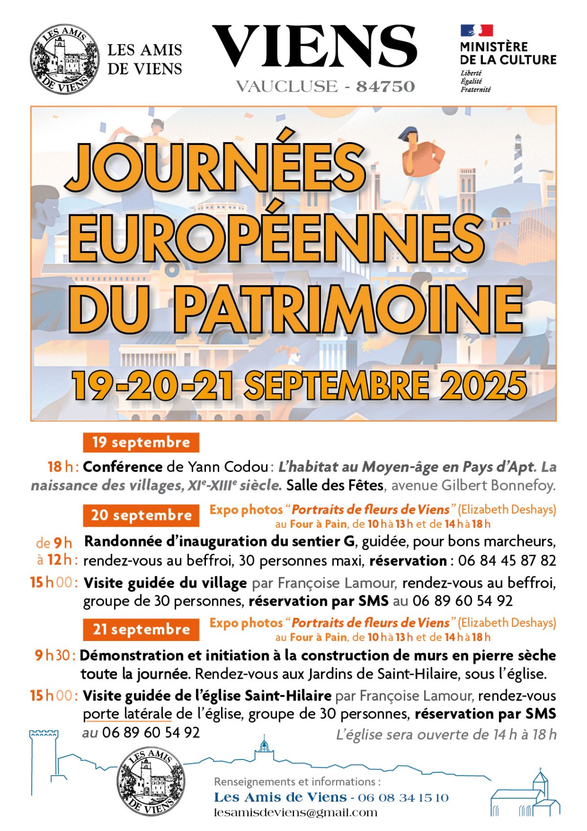 - 18h : Conférence de Yann Codou : L’habitat au Moyen Âge en Pays d’Apt. La naissance des villages, XIᵉ-XIIIᵉ siècle. Salle des fêtes, avenue Gilbert Bonnefoy.