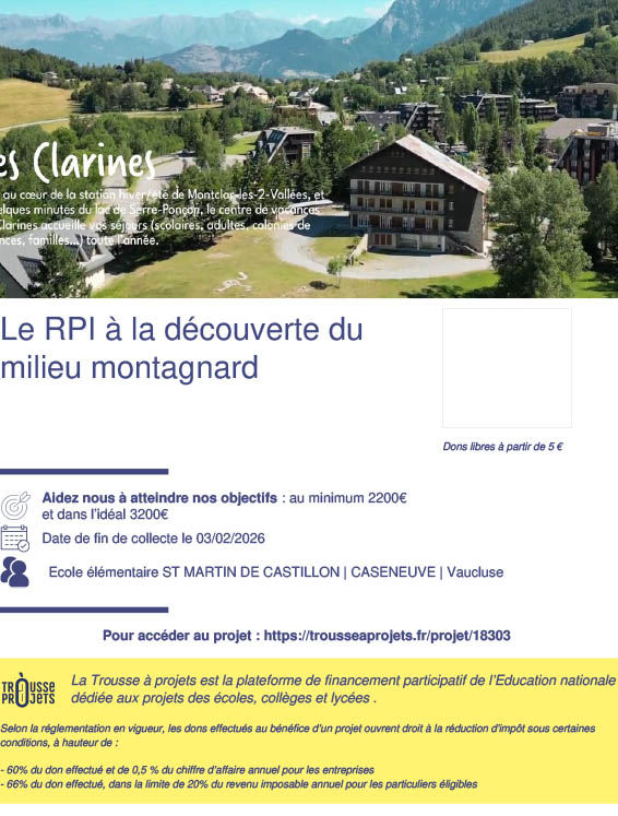 Les élèves, du CP au CM2, du RPI (Regroupement Pédagogique Intercommunal) de Caseneuve, Viens et St Martin de Castillon iront en classe découverte au mois d’avril à St Jean Monclar.