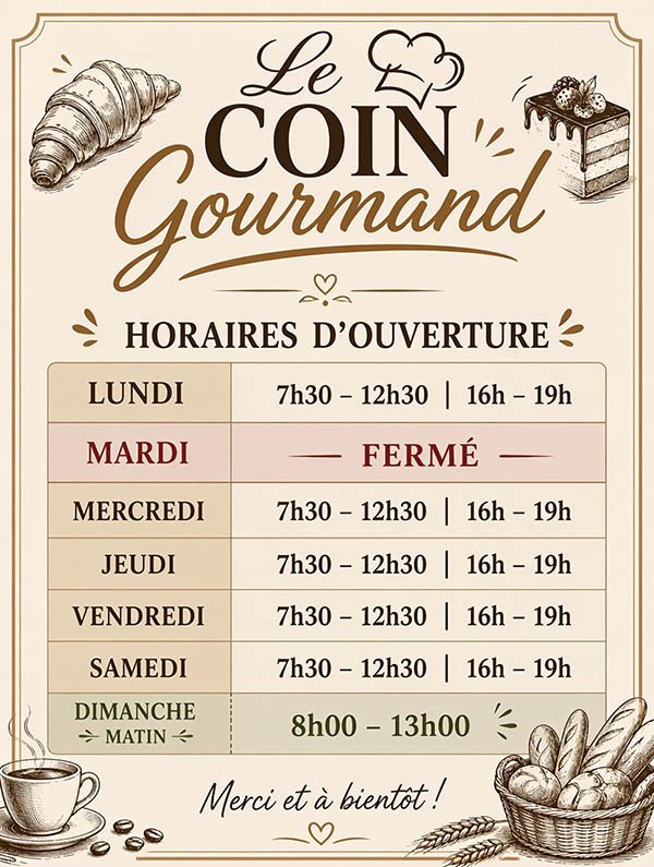 Nous sommes heureux de vous annoncer l’ouverture du coin gourmand, dépôt de pain, viennoiserie, pâtisseries, sandwicherie, boissons fraiches, gâteaux secs et prochainement service rôtisserie et point relais colis.