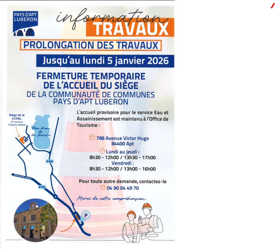 Nous vous informons que les travaux en cours sont prolongés. En conséquence, le déplacement temporaire de l’accueil du service Eau et Assainissement est également prolongé jusqu’au 5 janvier 2026.